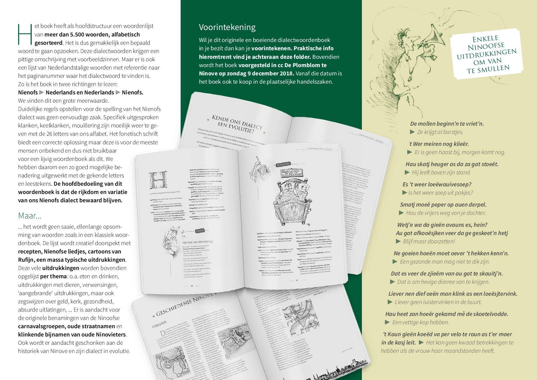 NINOVE – De Werkgroep ter bevordering van het Nienofs dialect geeft het dialectwoordenboek ‘Algemieën Bekoest Nienofs’ uit. Dit gebeurt met de medewerking van de stad Ninove en de erfgoedraad. Voorintekenen kan nog tot eind september 2019 voor de zachte prijs van € 18,00.