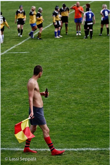 De figuur op de foto laat zich in ieder geval niet verdorsten en kijkt rustig toe hoe de voetballers terechtgewezen worden.