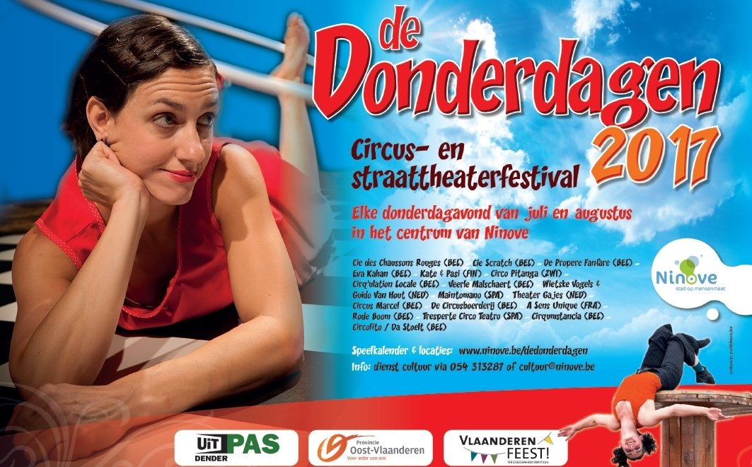 Ninove – Nieuwe Shows van Oude Belgen en een oude show van een bijna-Belg. Twee acts uit de finale van Belgium’s got talent. Een Vlaamse première. Twee try-outs met internationale ambitie. Hoog bezoek uit het Hoge Noorden. De Donderdagen 2017 beloven oogstrelend poëtisch en adembenemend spectaculair te worden. Elke donderdag van juli en augustus wordt Ninove de circus- en straattheaterhoofstad van Zuid-Oost-Vlaanderen.