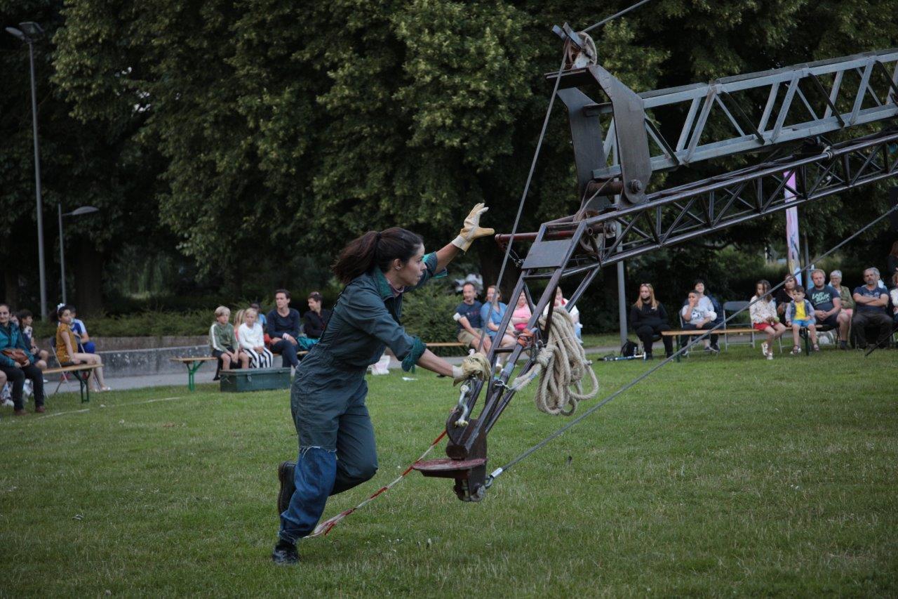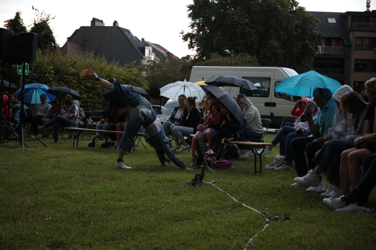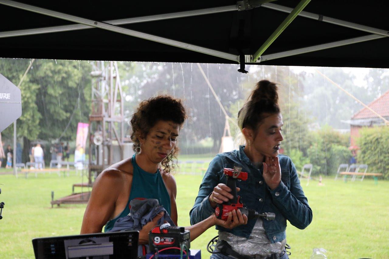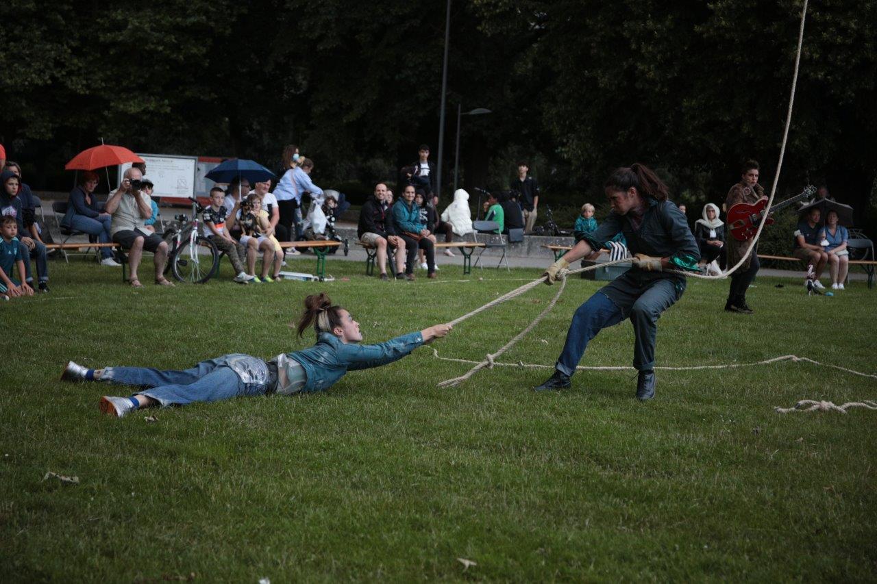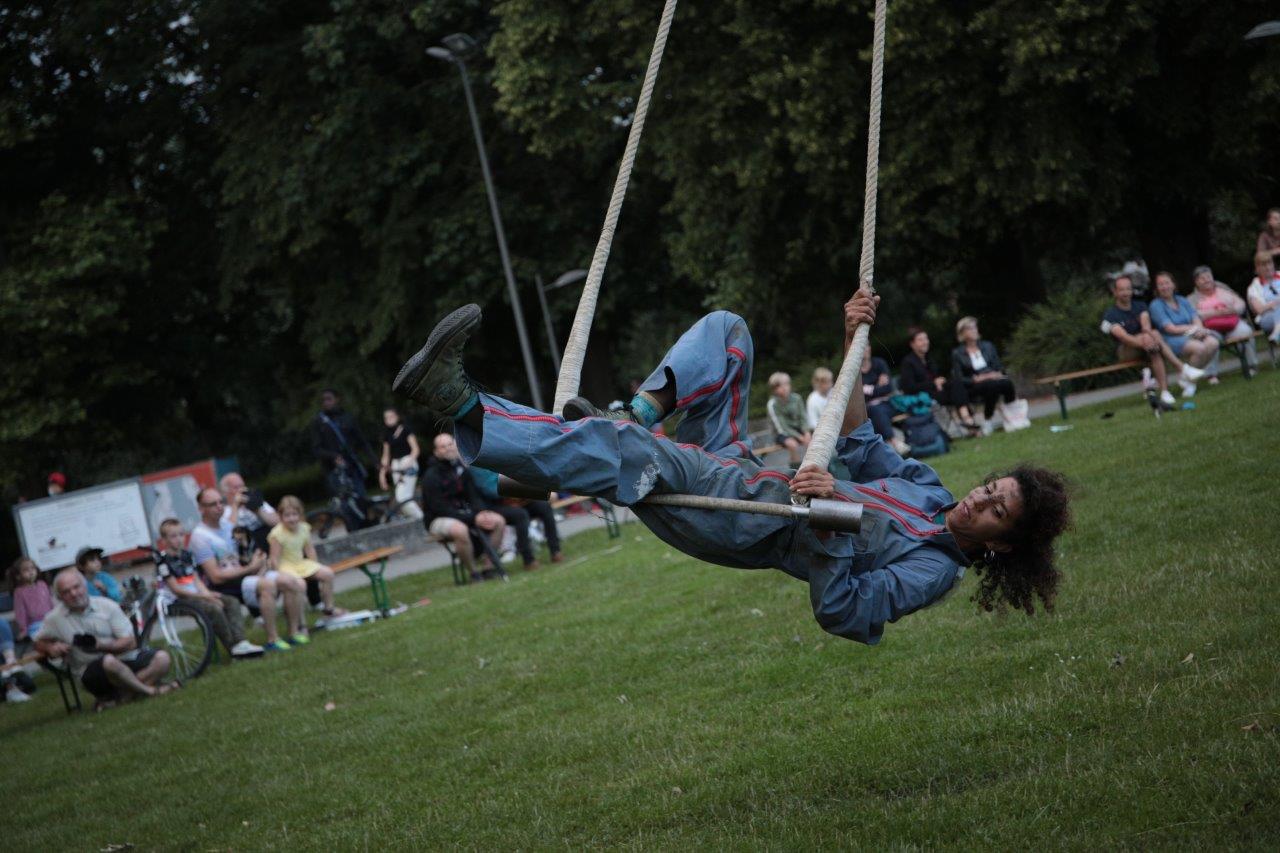 Het publiek kon bij de start van de voorstelling nog genieten van een fijn zonnetje. Naarmate de act vorderde, trok de hemel steeds meer dicht. Tenslotte moest de voorstelling worden ingekort door een kort maar krachtig onweer boven het stadspark.