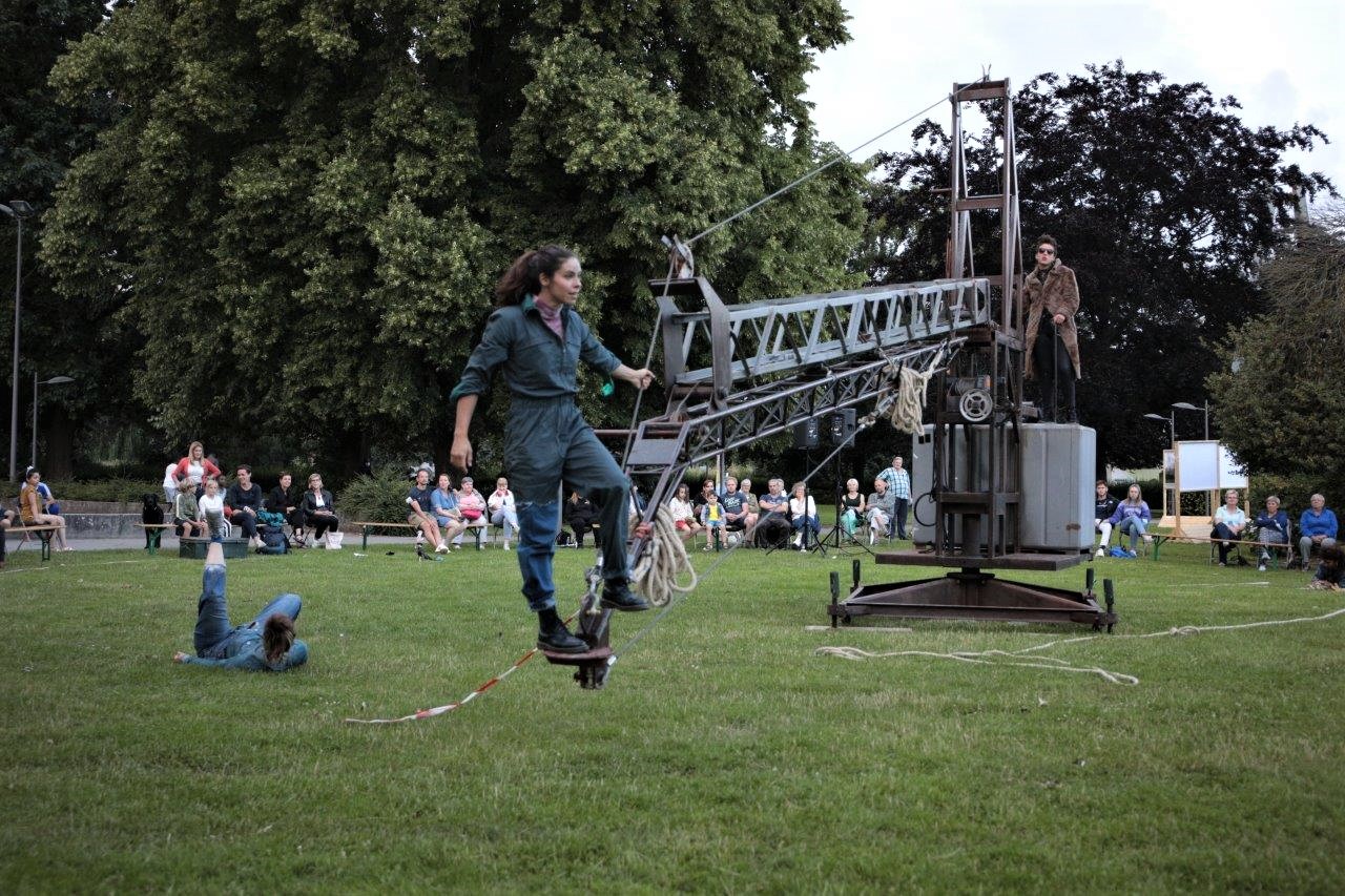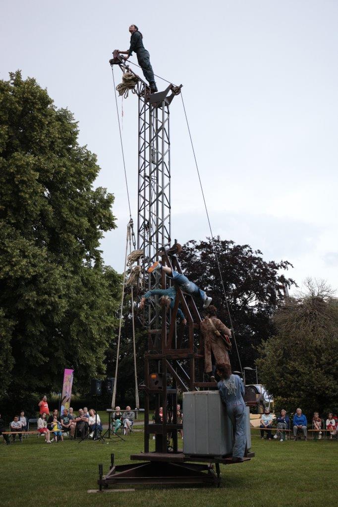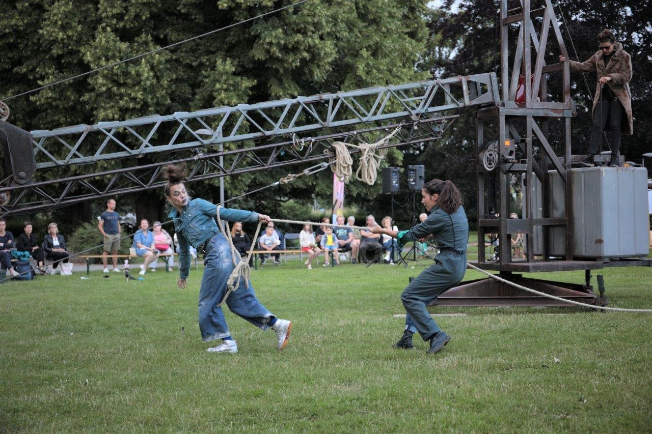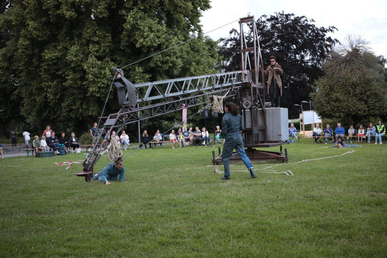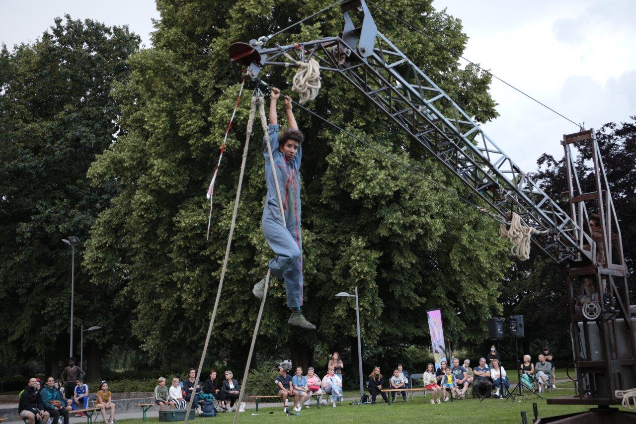 Het publiek kon bij de start van de voorstelling nog genieten van een fijn zonnetje. Naarmate de act vorderde, trok de hemel steeds meer dicht. Tenslotte moest de voorstelling worden ingekort door een kort maar krachtig onweer boven het stadspark.