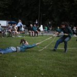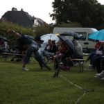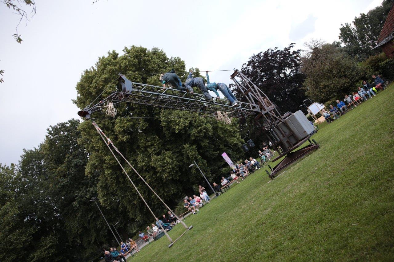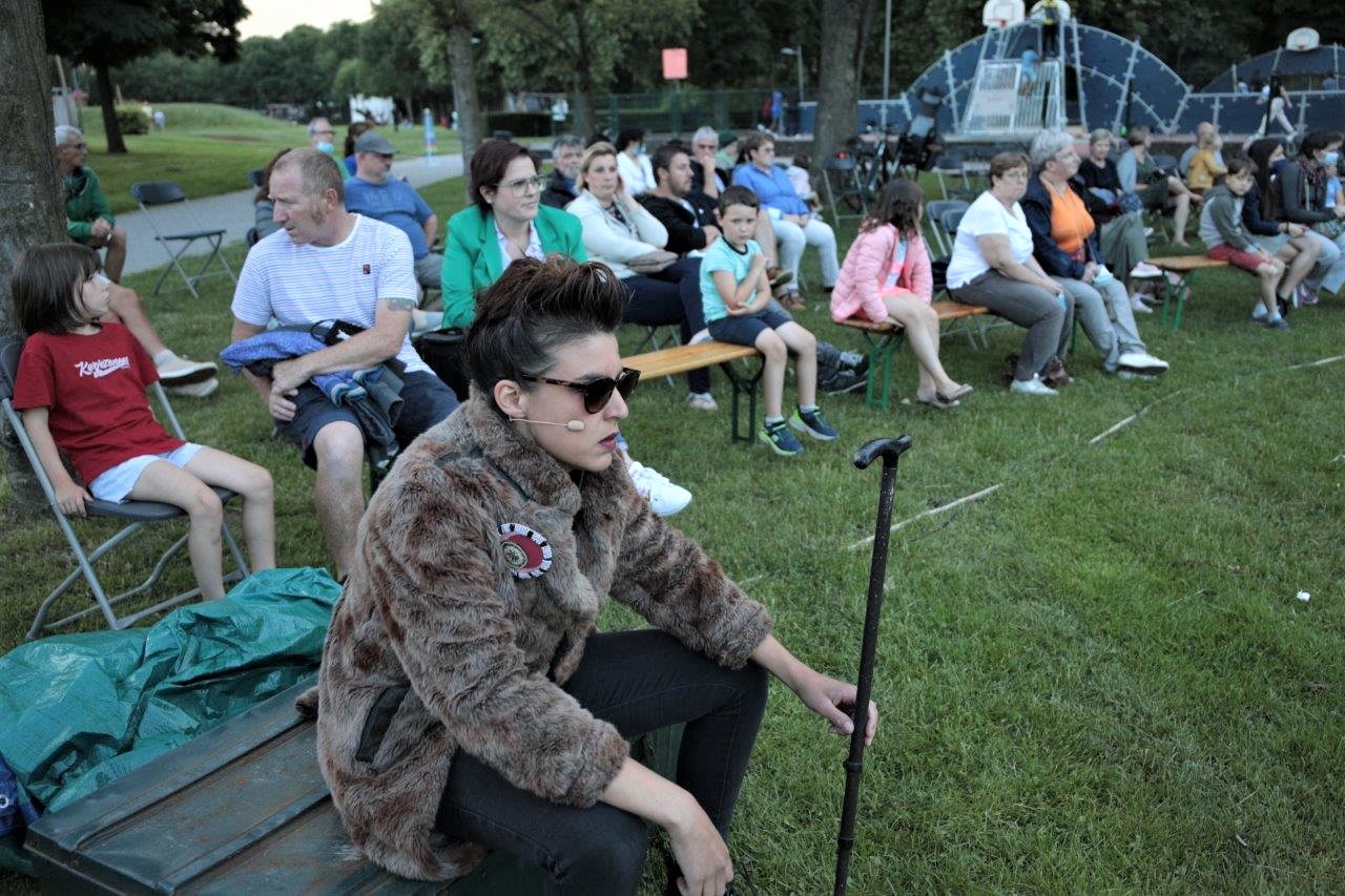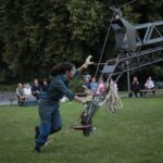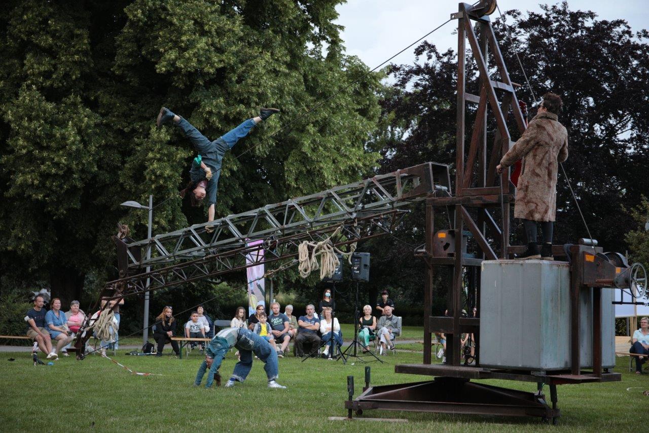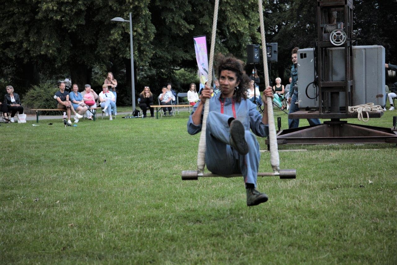 Het publiek kon bij de start van de voorstelling nog genieten van een fijn zonnetje. Naarmate de act vorderde, trok de hemel steeds meer dicht. Tenslotte moest de voorstelling worden ingekort door een kort maar krachtig onweer boven het stadspark.