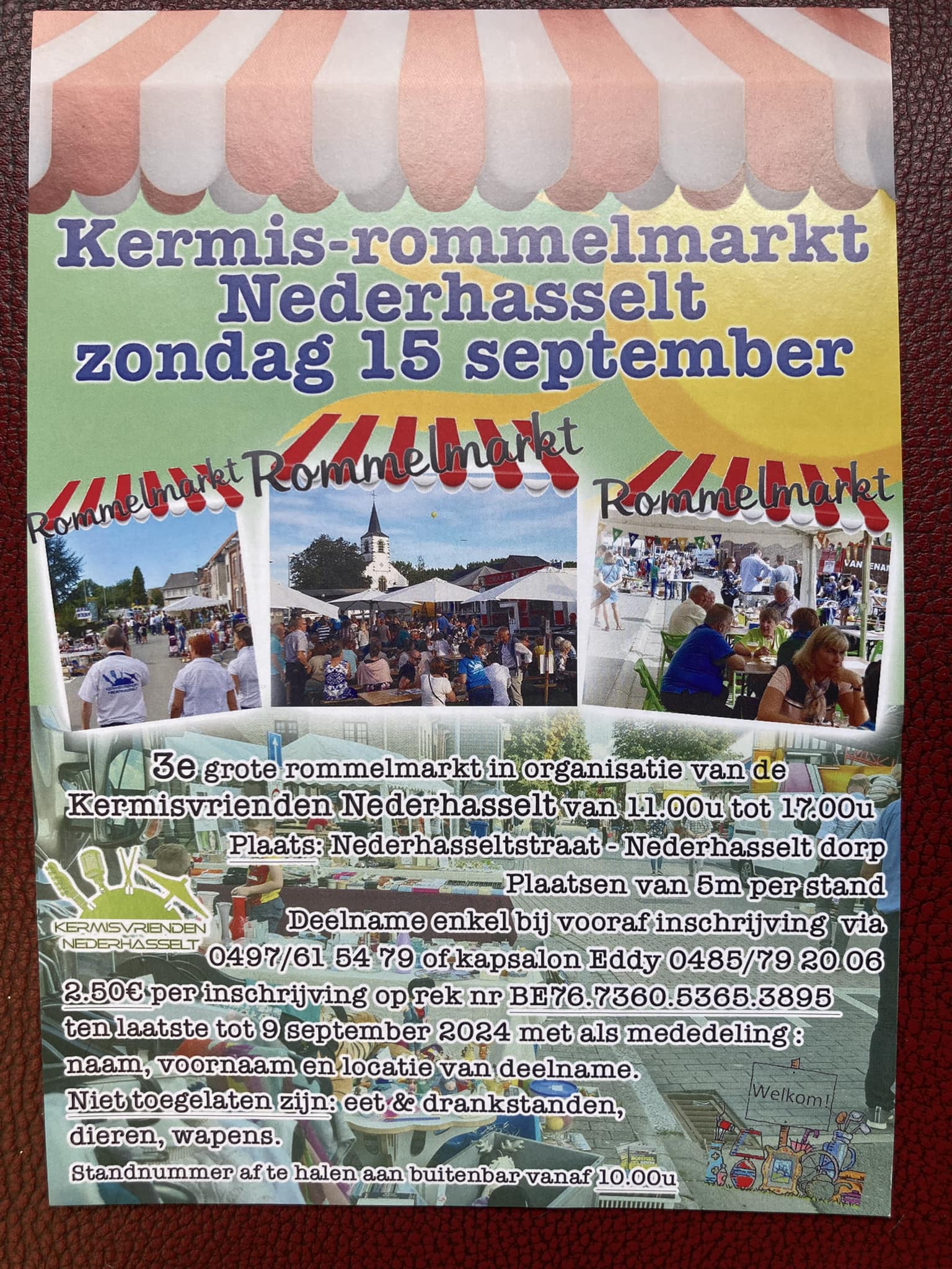 Zondag 15 september heeft een rommelmarkt plaats, tussen 11 en 17 uur in de Nederhasseltstraat en op het Dorp. Vooraf inschrijven is noodzakelijk: via 0485-79 20 06 of bij kapsalon Eddy aan het dorpsplein.