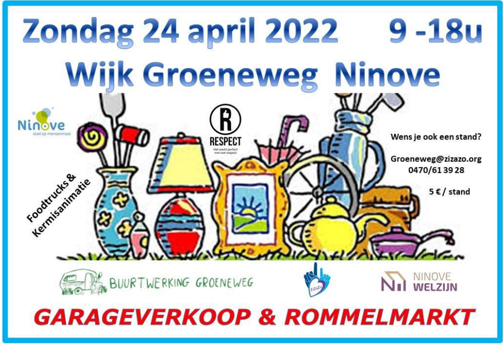 NINOVE – De vzw ZiZaZo organiseert in samenwerking met Ninove Welzijn en Buurtwerking Groeneweg zondag 24 april een garageverkoop en rommelmarkt.