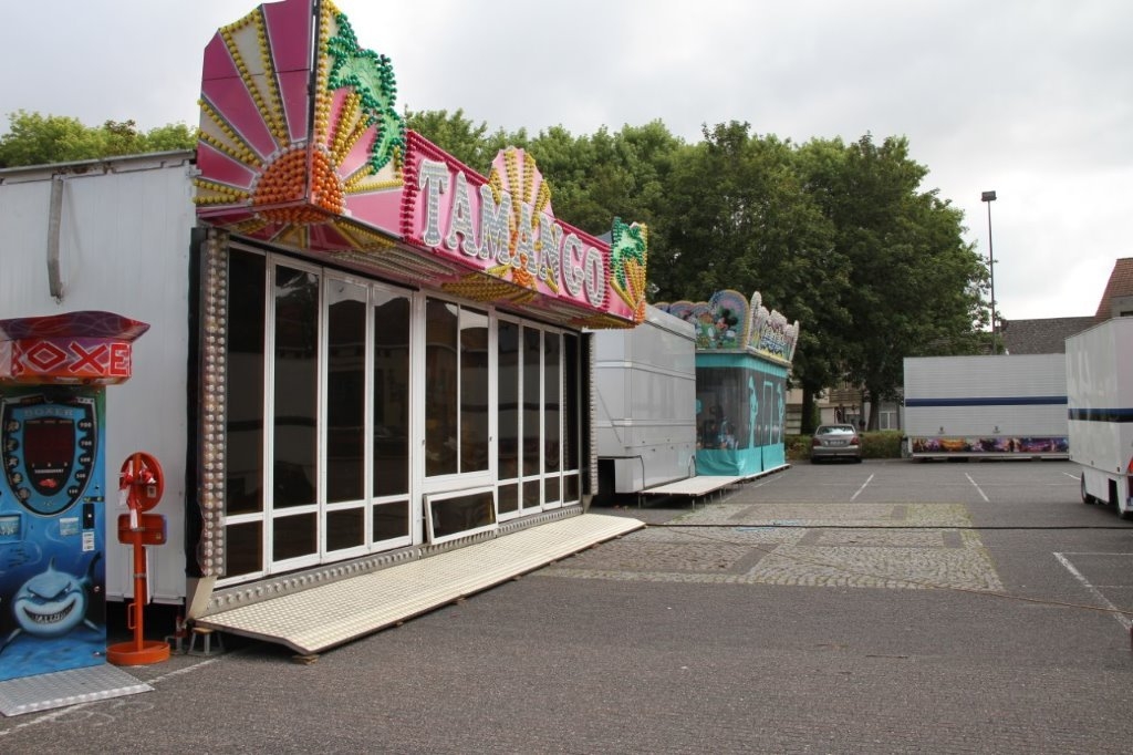 De attracties staan opgesteld en het podium staat klaar op het Dr Hemerijckxplein voor wijkkermis Burchtdam. Ook voor frietjes of oliebollen en escargots kan men er terecht.