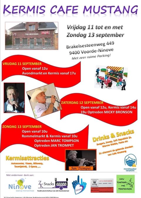 Zondag 13 september tenslotte zijn er vanaf 10 uur een rommelmarkt en de kermis. Later op de dag kun je genieten van ambianceoptredens door Marc Tompson en Jan Trompet. Beide zijn zeer gekend in Ninove en omstreken om hun meezingers van alle grote Nederlandstalige ambiancenummers. Ook anderstalige hits passeren de revue.
