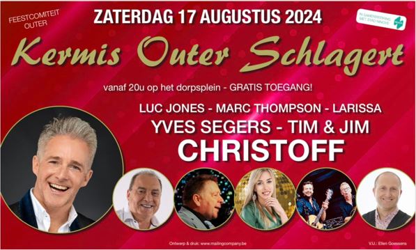 OUTER – Het feestcomiteit organiseert zaterdag 17 augustus opnieuw ‘Kermis Outer Schlagert’. Met Christoff, Yves Segers, Luc Jones, Marc Thompson, Larrissa en Tim & Jim is de ambiance verzekerd.