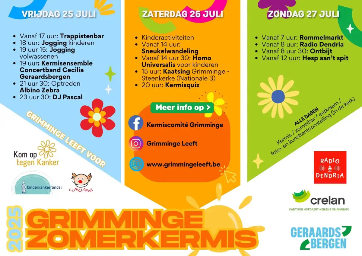 Grimminge Leeft! en het Kermiscomité stelden een gevarieerd programma samen voor jong en oud. Het hele weekend staan doorlopend kermisattracties, een gezellige drankentent en eetstanden opgesteld en kan je in de kerk terecht voor een kunsttentoonstelling.