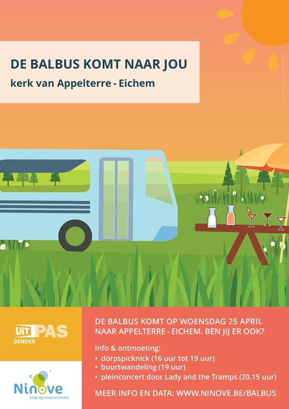 Om de – hopelijk – warme dagen mooi in te luiden start de dienst cultuur van Ninove in samenwerking met de bib op woensdag 25 april met de “BAL-bustournee”. Tot en met 4 juli wordt iedere woensdag een deelgemeente in de kijker gezet. Telkens vanaf 16u zijn alle inwoners uitgenodigd om deel te nemen aan een aperitief en picknick moment. Het stadsbestuur zorgt voor een hapje, de vloeibare lekkernijen breng je zelf mee. Om 18.30u is de bus het vertrekpunt voor een wandeling doorheen de gemeente. Rond half negen kan je genieten van een streepje muziek van een lokale artiest. Om 22u sluit de bus zijn deuren.