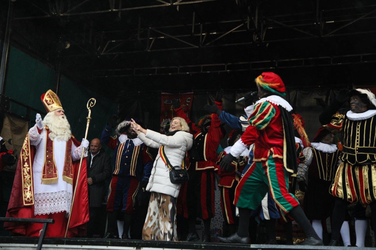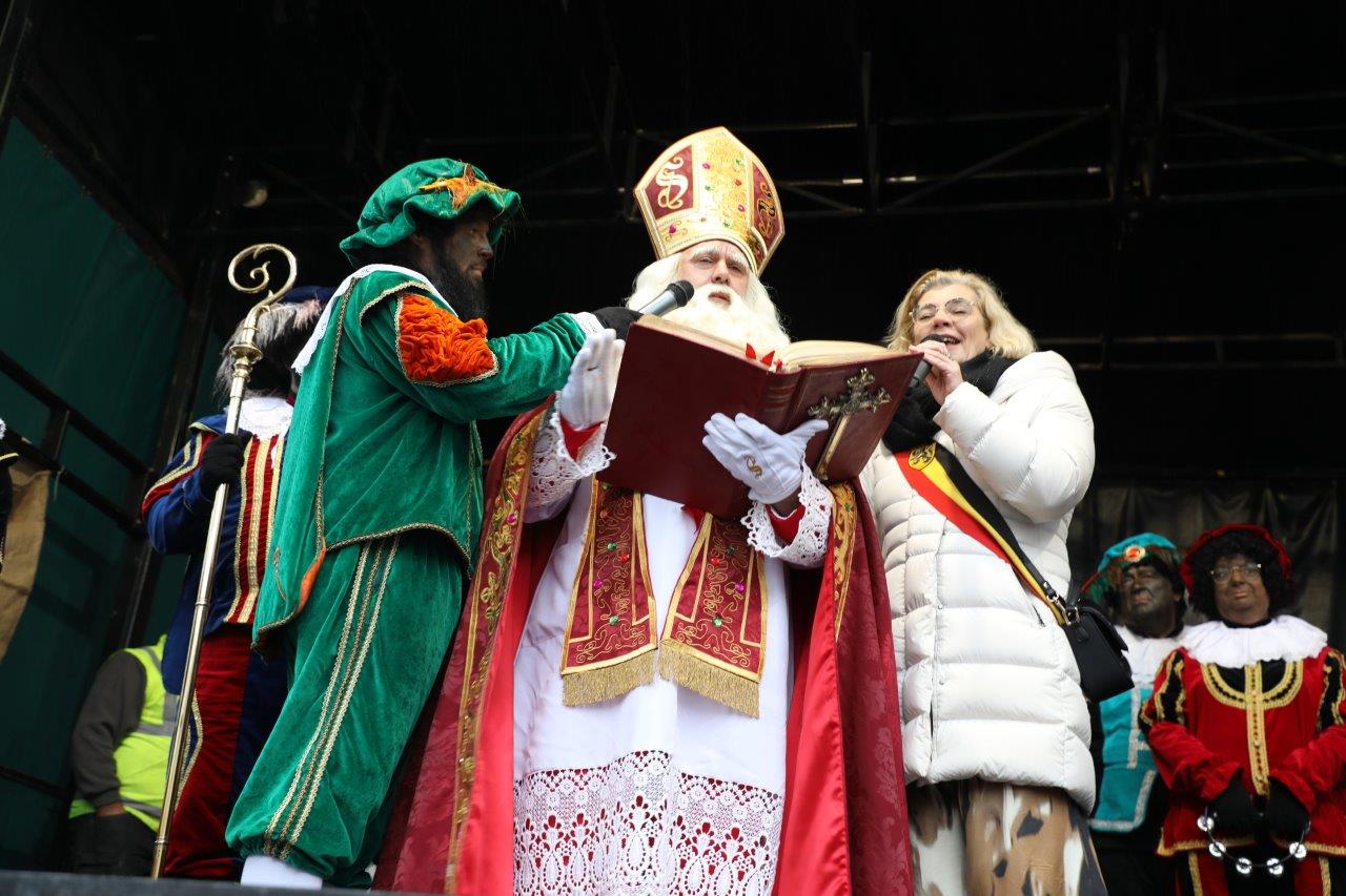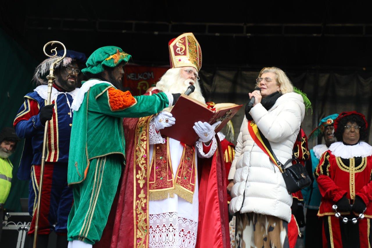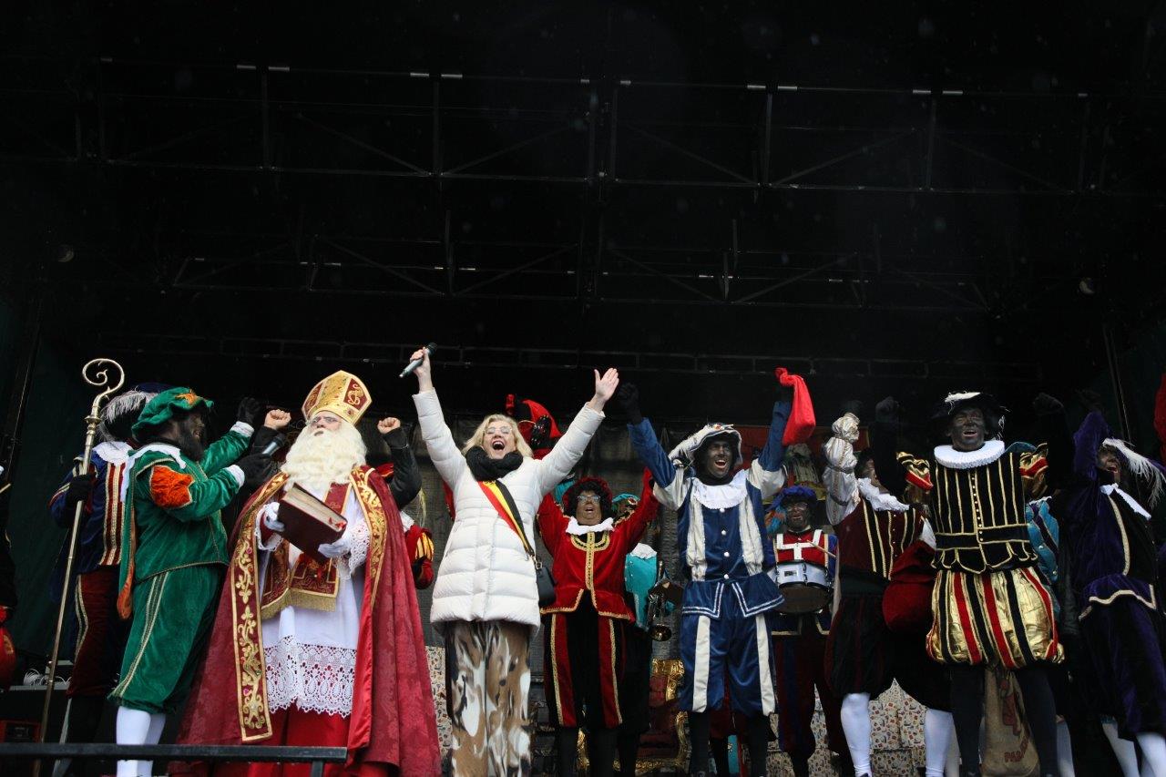 Burgemeester Tania De Jonge en schepen voor lokale economie Alain Triest verwelkomden de goedheilige man en zijn 20 roetpieten.