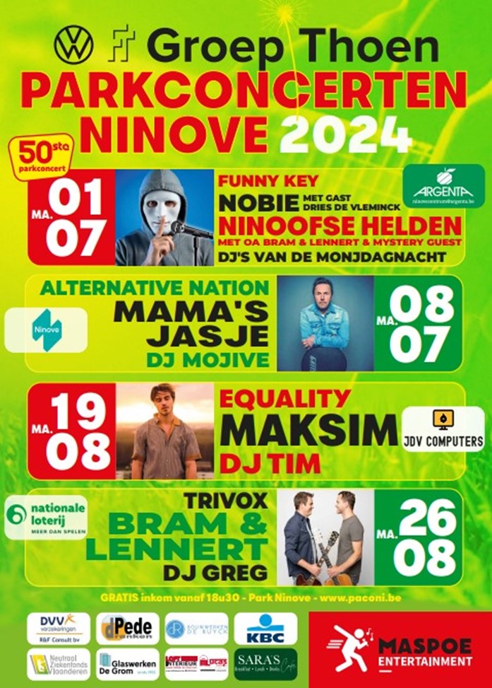 Maandag 1 juli zal het meteen raak zijn met een feesteditie voor het 50ste parkconcert ooit. Voor dat specialleken zorgen Funny Key, Nobie met gast Dries De Vleminck, Ninoofse Helden met o.a. Bram & Lennert, een mystery guest en dj’s van de Mondagnacht.