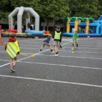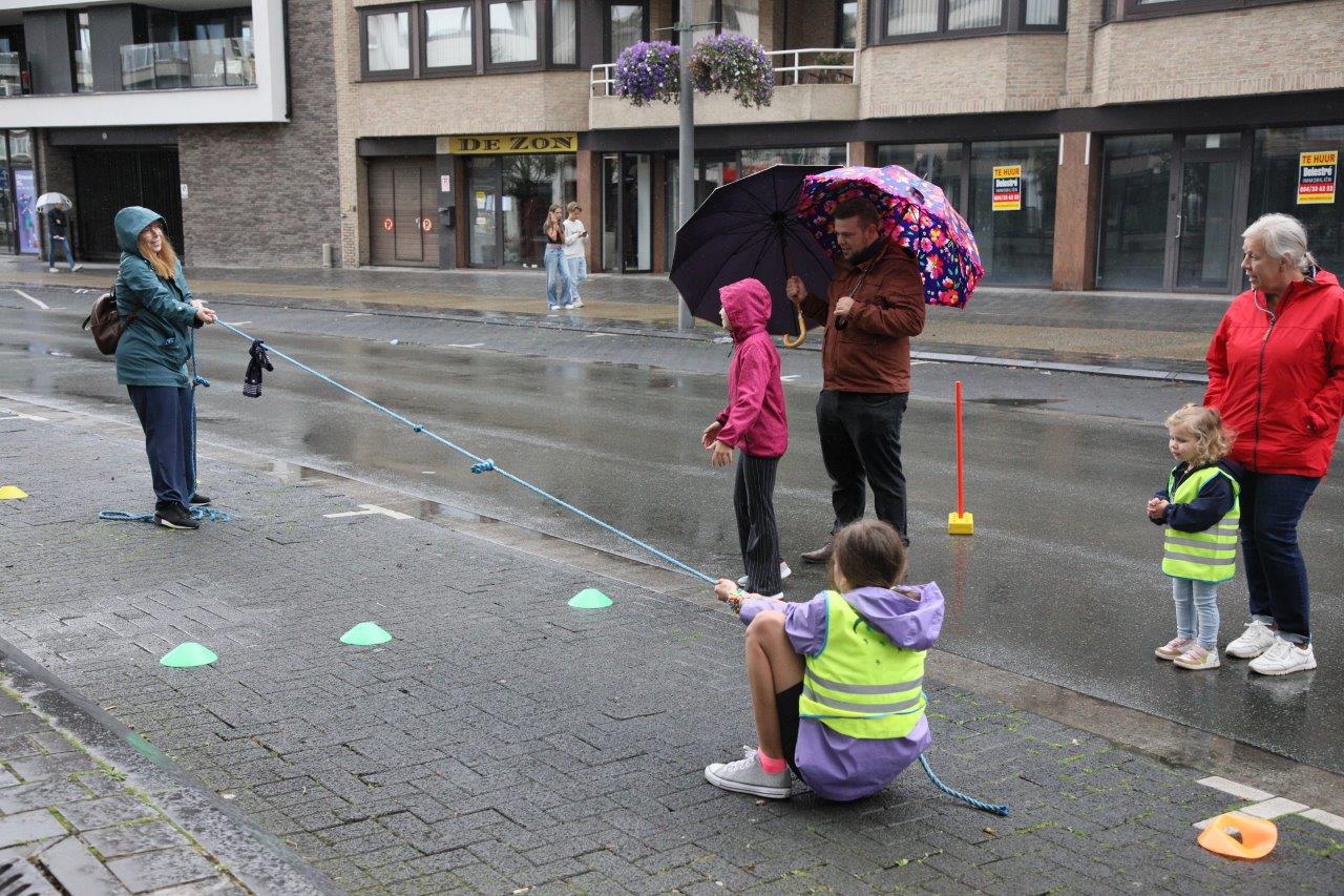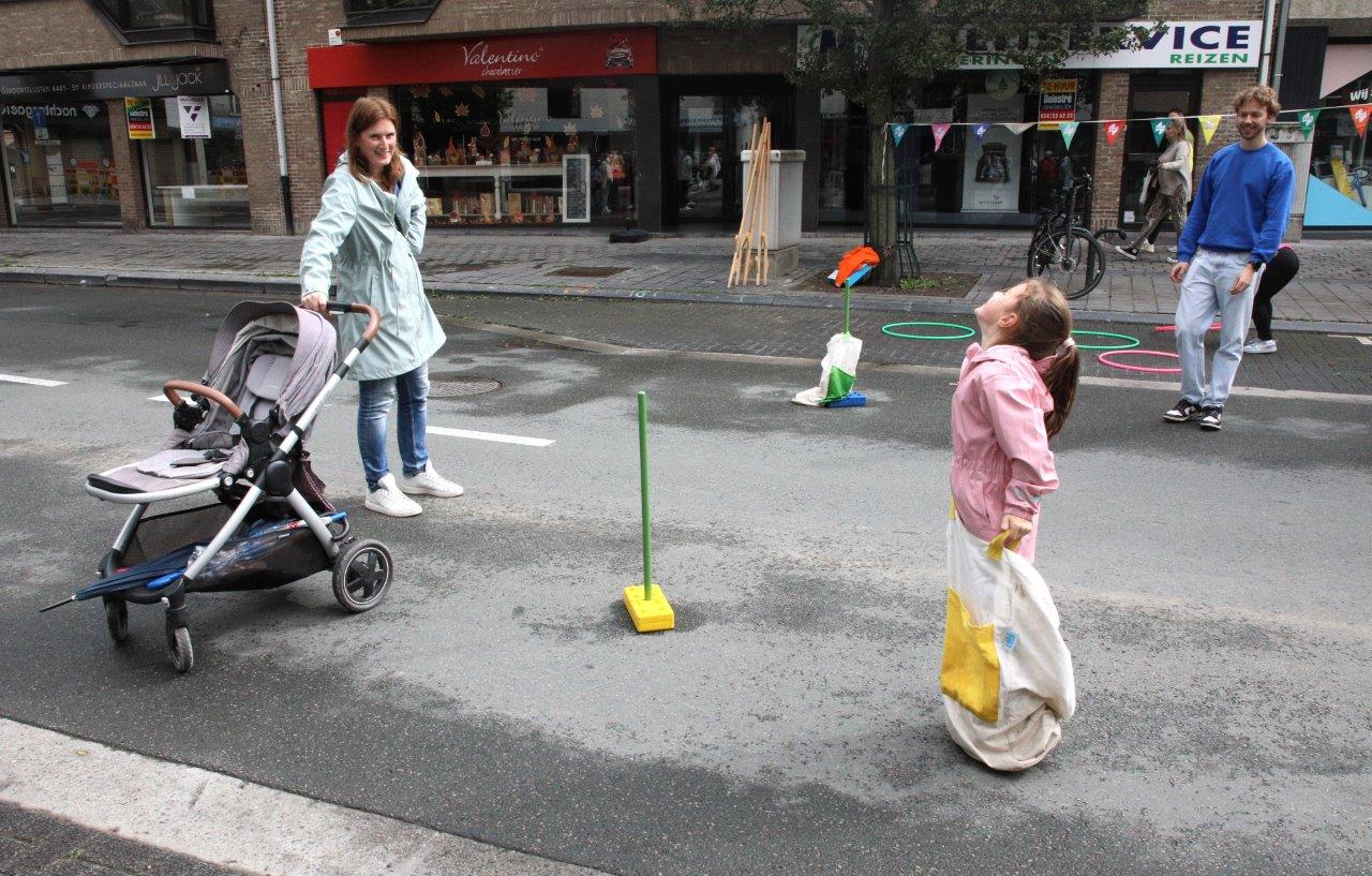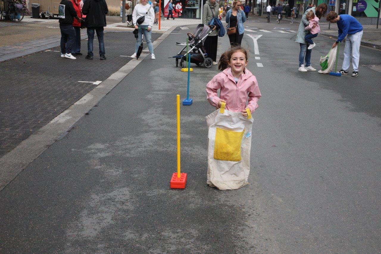 Langsheen de Centrumlaan kon je een wedstrijdje zaklopen, touwtrekken, knikkeren of bikkelen; spelletjes uit de oude doos dus.