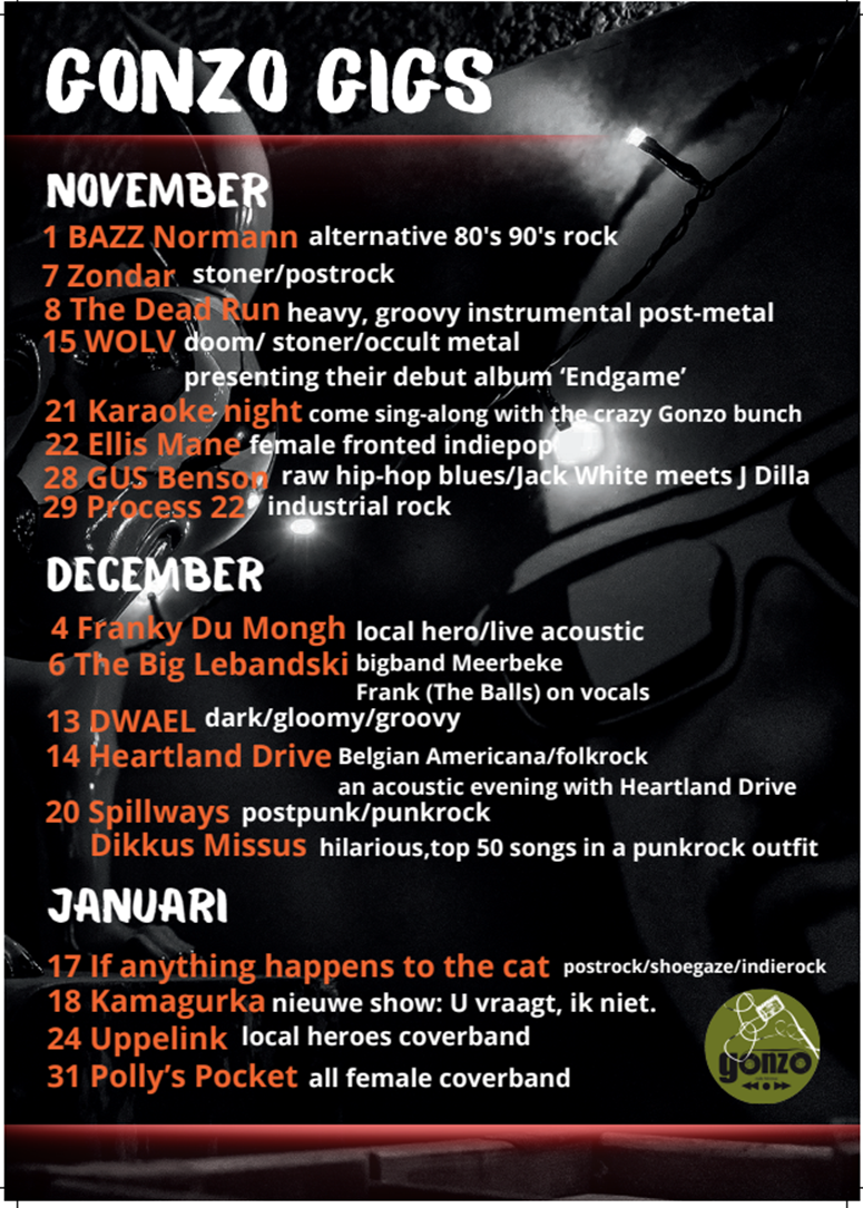 Deze en andere optredens hebben plaats in café Gonzo, Hemelrijk 2 Meerbeke. Ze beginnen telkens om 22 uur, tenzij anders vermeld.