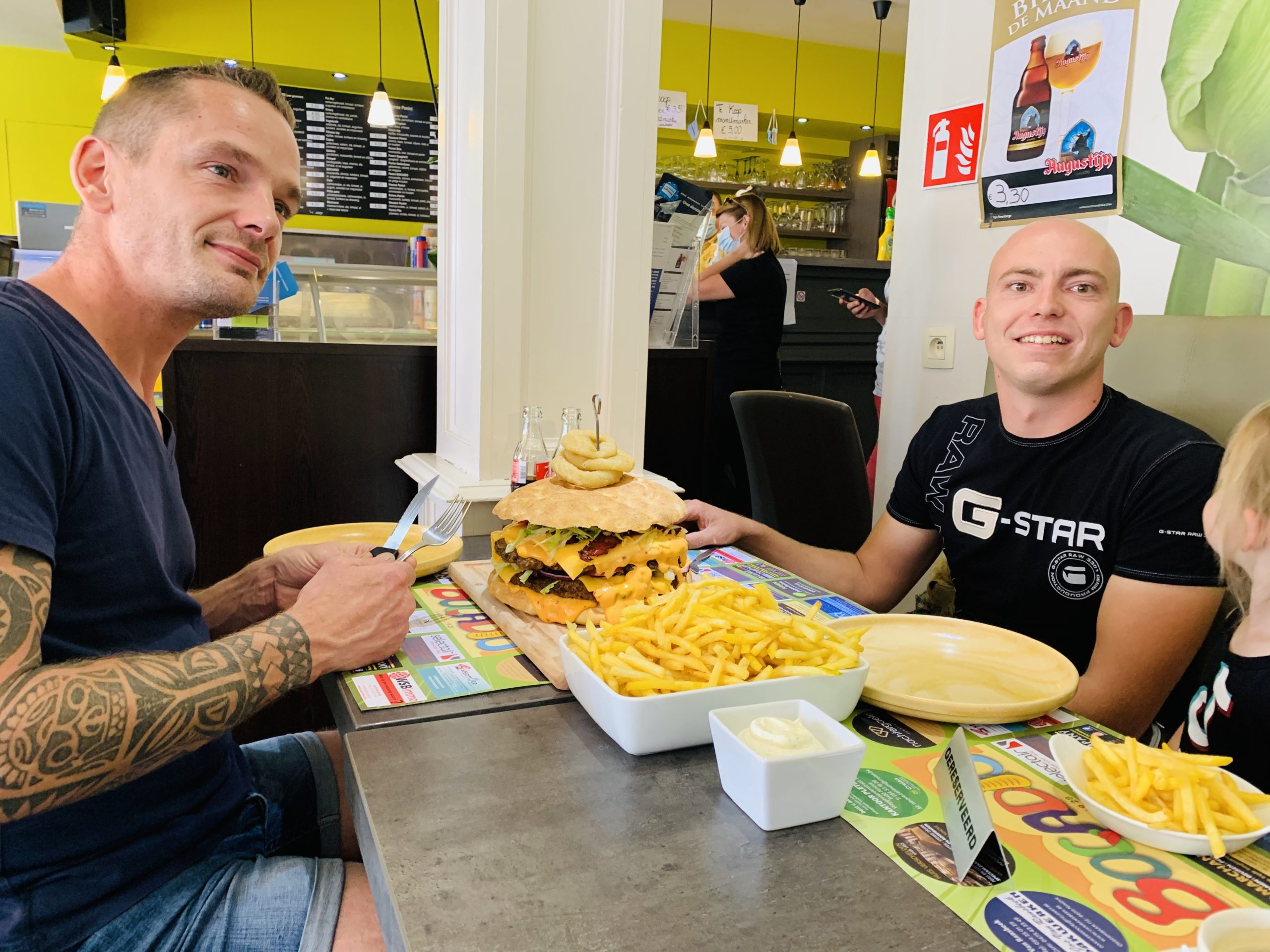 Carla somde even op wat die reuzenhamburger opvatte: “Een hamburger van gehakt natuur, peterselie, kaas, tomaten, sla, spek, een zelfgemaakte saus, een brood(je), 1 kg friet en uienringen.”