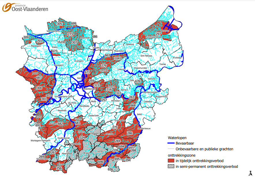 Concreet mag vanaf vrijdag 7 juli 2023 geen water worden opgepompt worden uit alle onbevaarbare waterlopen en publieke grachten in 42 onttrekkingszones. Voor onze regio zijn dat de volgende zones.